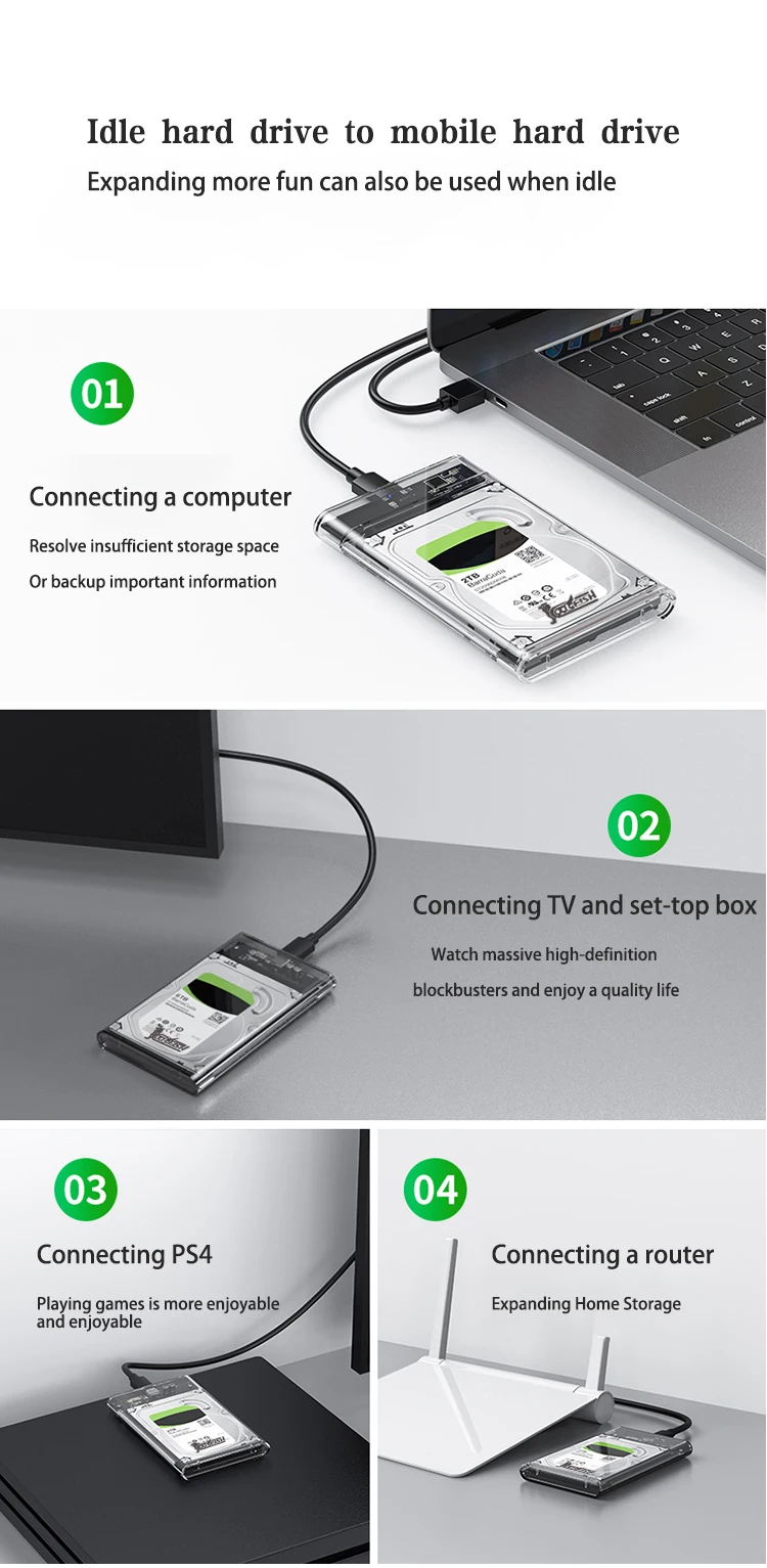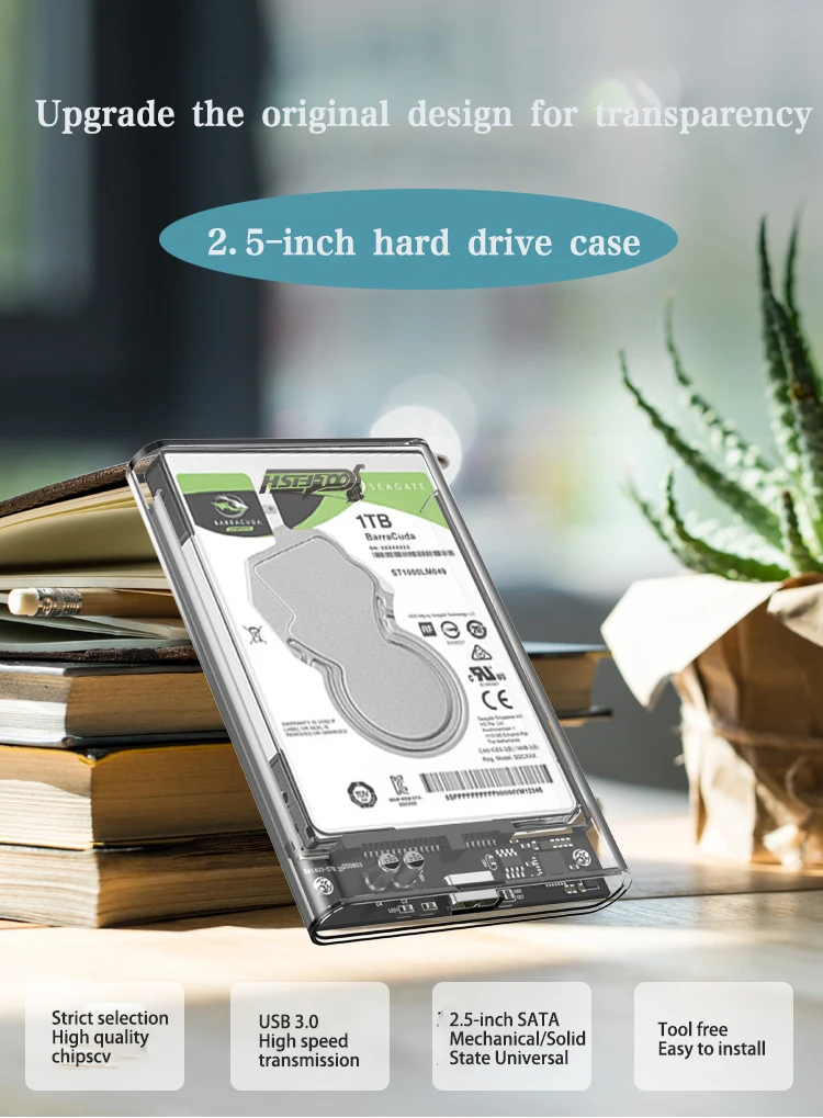 حافظة CoolFish USB 3.0/Type C 2.5 بوصة SATA SSD للقرص الصلب الخارجي، حافظة شفافة للقرص الصلب، تدعم الاستخدام بدون أدوات بسرعة 5 جيجابت في الثانية