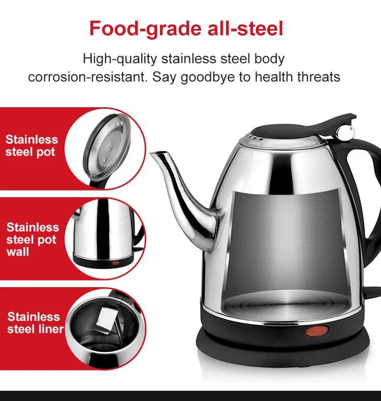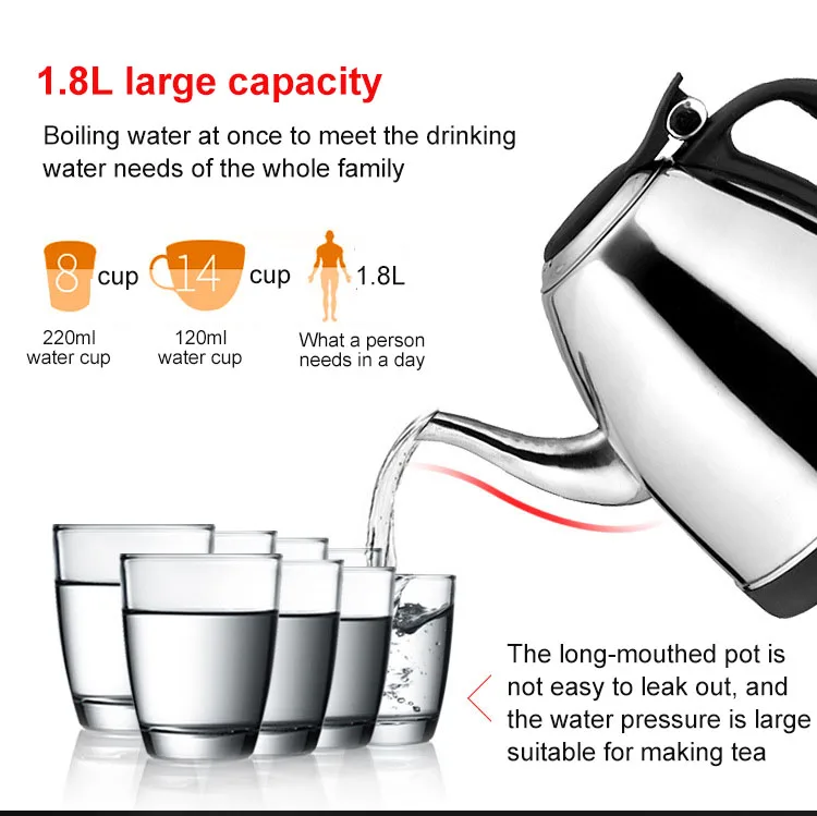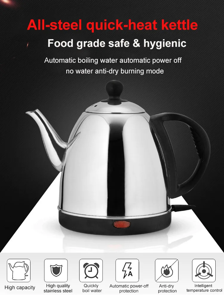غلاية كهربائية طويلة الفم أنيقة وفعّالة من الفولاذ المقاوم للصدأ، مصممة للتسخين السريع. بسعة 1-2 لتر، تغلي الماء في 4-6 دقائق فقط، مما يجعلها مثالية للمشروبات الساخنة أو الطهي.