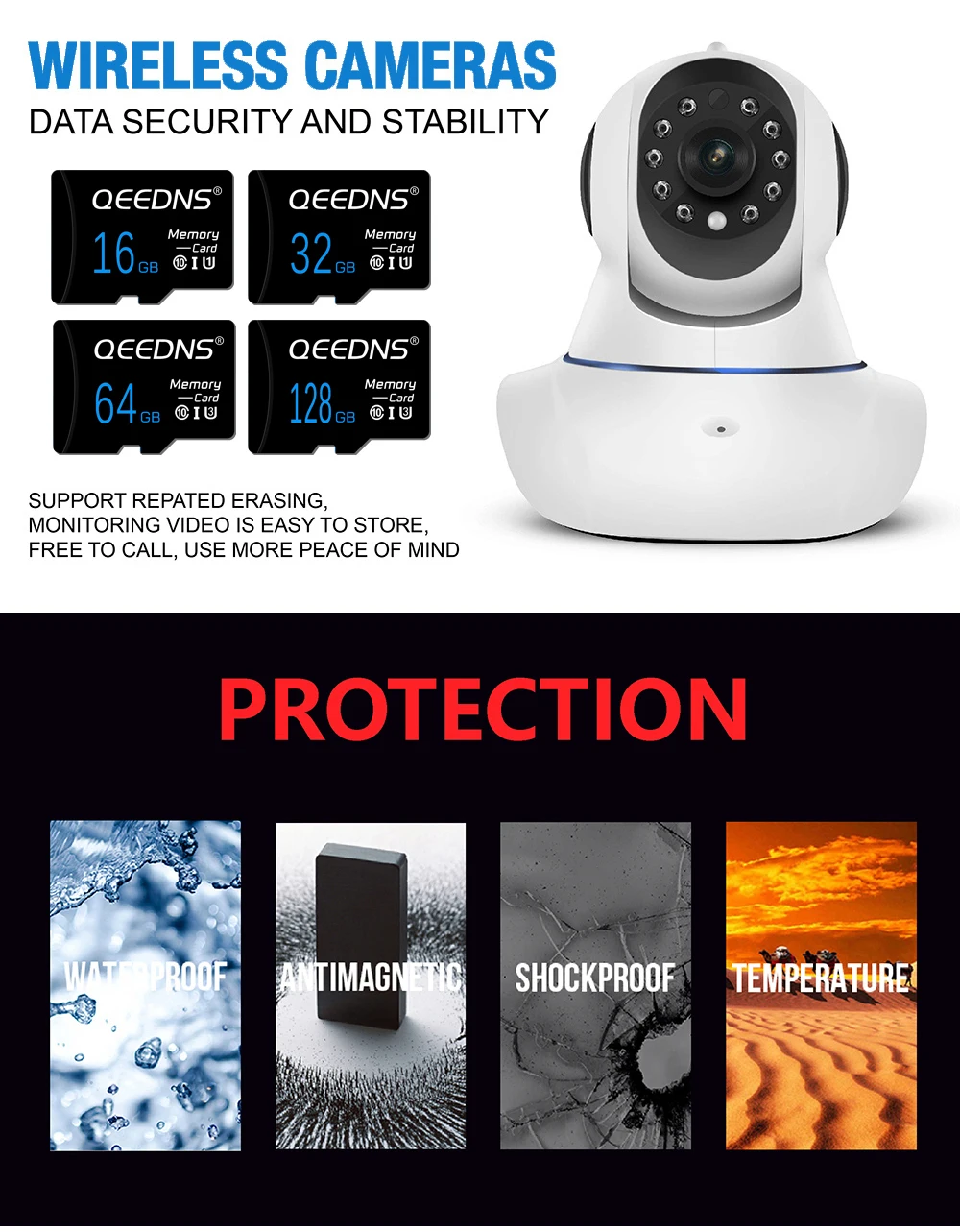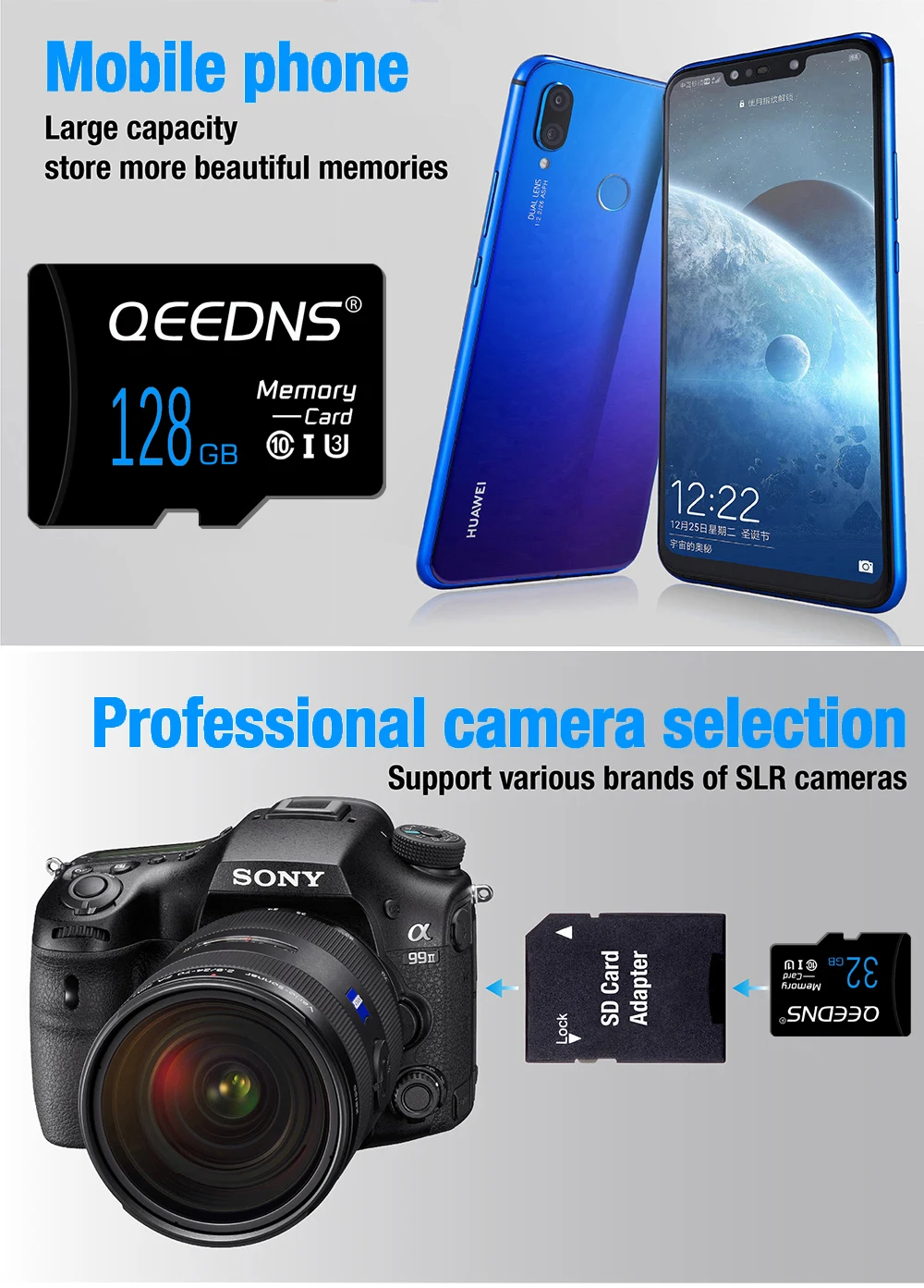 تتوفر بطاقة Micro TF SD بسعات متعددة: 256 جيجابايت، 128 جيجابايت، 64 جيجابايت، 32 جيجابايت، 16 جيجابايت، و8 جيجابايت. صُممت هذه البطاقة من الفئة 10 لعمليات قراءة وكتابة عالية السرعة، وهي مثالية لمختلف الأجهزة الرقمية، بما في ذلك الهواتف المحمولة، والأجهزة اللوحية، والكاميرات، وغيرها.