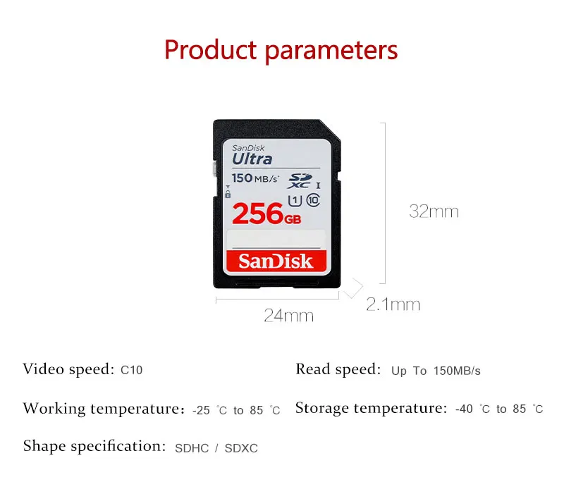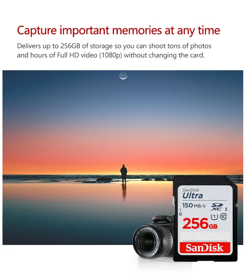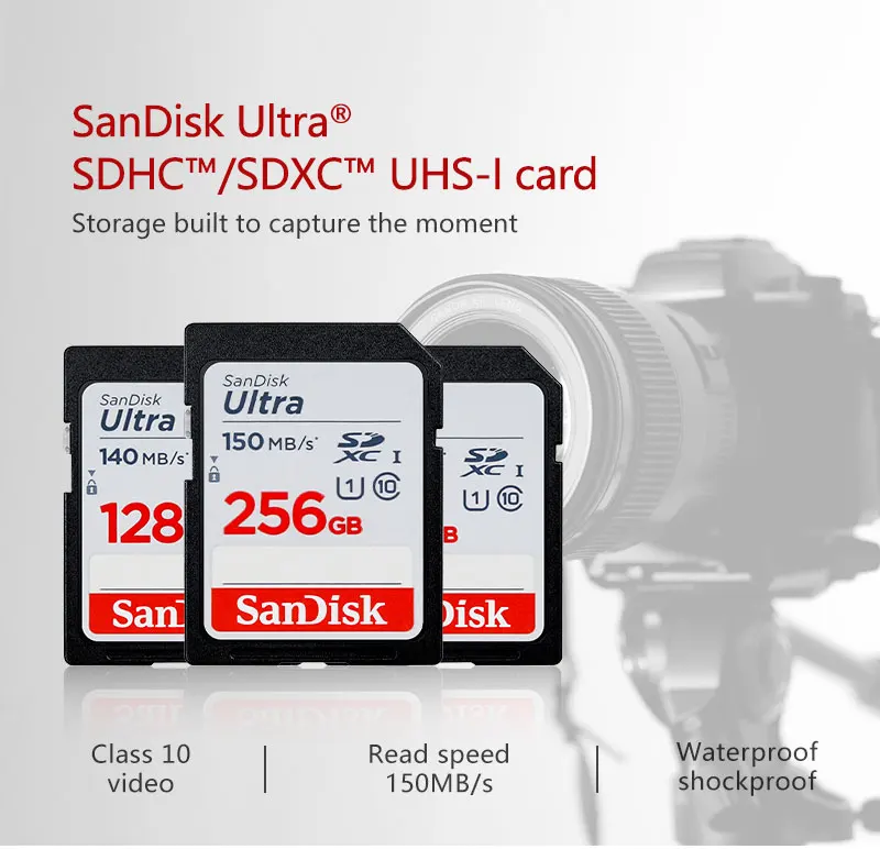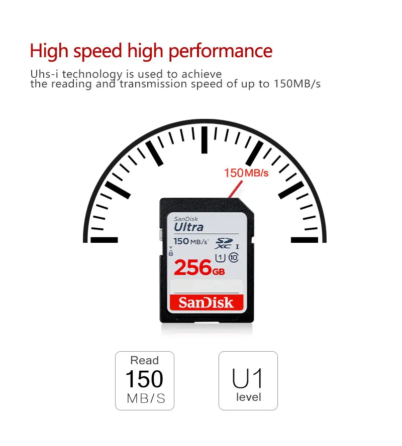 بطاقة ذاكرة فلاش SanDisk الأصلية SD U1 C10 Ultra بسعة 32 جيجابايت و64 جيجابايت و128 جيجابايت و256 جيجابايت SDHC / SDXC بسرعة عالية تصل إلى 150 ميجابايت/ثانية للكاميرا